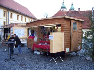 Verkaufsanhänger für Weihnachtsmarkt, aufgebaut aus einem alten Wohnwagenfahrgestell