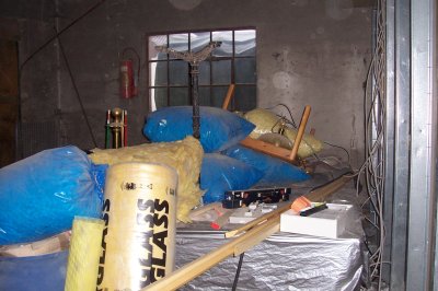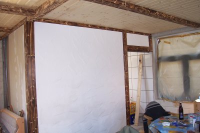 Das ist die Zwischenwand, hier der Locanta-Raum, rechts mit Folie verhangen, die Tür zu den Toiletten und dem Nebenraum....die Wände wurden verputzt, die "Holzbalken" sind Eigenbau und wurden von mir mit einem Bunsenbrenner "geflammt", sowohl an den Wänden als auch an der Decke