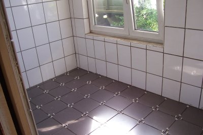 Die Küche, da bin ich gerade am fliesen des Fussbodens....