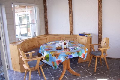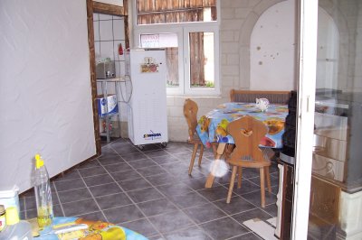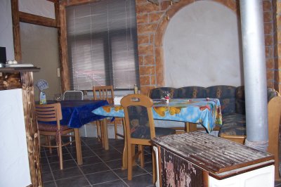 Das ist die Sitzgruppe mit Eingangstür und Blick in den Biergarten, neue Fenster wurden verbaut und die Wände in "Steinoptik" verputzt....