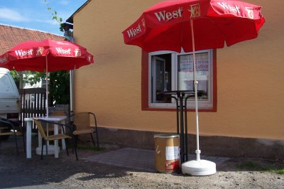 Hier noch n Foto von der Aussenansicht mit den Stehtischen und Sonnenschirmen, als ich meinen Imbiss - Strassenverkauf noch geöffnet hatte