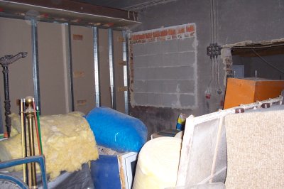 Durch die neue Trennwand wurde die Halle abgeteilt, eine Hälfte wird Kneipe und die andere Hälfte teilt sich auf die Toiletten und einen Nebenraum für geschlossene Gesellschaften auf