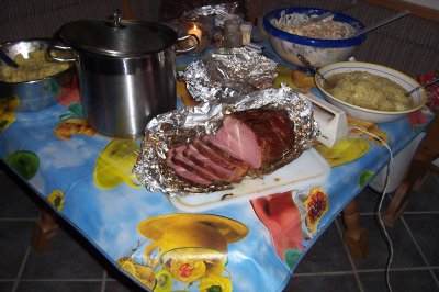 Mein Arbeitskollege hatte hier seine Weihnachtsfeier und ich hab gekocht, Römerbraten aus dem Smoker mit Kartoffelsalat, Krautsalat, Djuwec-Reis und Schichtsalat für 15 Personen