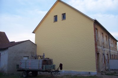 Nachdem der Putz 2 Wochen Zeit hatte zum trocknen, hab ich dann erst Putzgrund aufgetragen auf die gesamte Fläche und dann 2 Anstriche mit der Fassadenfarbe gemacht.........