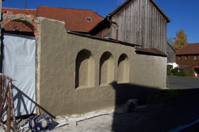 Hier ein Teil der Aussenmauer mit den Rundbögen nach dem Verputzen, Farbe fehlt natürlich noch........